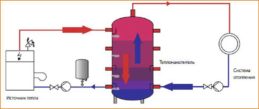 Необходимо помнить что чем дальше от котла находится устройство, тем больший участок трубопровода придется проложить, а это лишние потери тепла. Аккумулятор включается параллельно уходящему их котла трубопроводу. Это делается для того чтобы можно было вывести его из работы. Для этого же в трубопровод врезается вентиль.