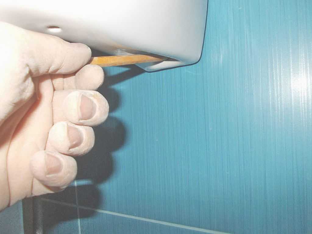 Перед тем, как сдвигать пьедестал для чаши и убирать раковину в сторону, необходимо проверить наличие силиконовой заливки в местах стыков. Обнаруженный силиконовой слой предварительно размачивают специальным средством – размягчителем для силиконового герметика. Остатки аккуратно счищаются строительным ножом.