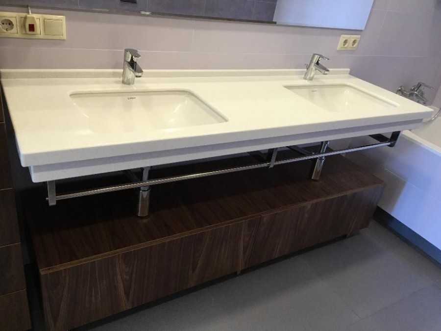 На необходимой высоте проводим горизонтальную линию по уровню. Примеряем тумбу, смотрим, как она будет совмещаться с сифоном и смесителем. Если нужно, сразу отмеряем и просверливаем в задней стенке дополнительные отверстия под сантехнику. Теперь устанавливаем кронштейны и на них тумбу. Как крепятся кронштейны мы рассказывали выше.