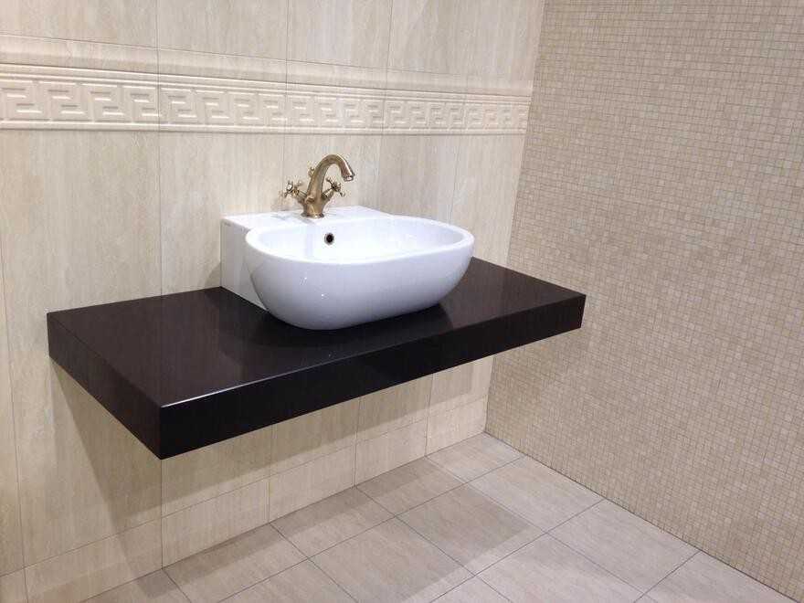 - Умывальник ставится на кронштейны, после чего на стену от уровня его верхнего края укладывается кафель. Стык между фаянсом и плиткой герметизируется силиконовым сантехническим герметиком. Именно сантехническим: в нем присутствуют антигрибковые добавки, в отличие от большей части универсальных.