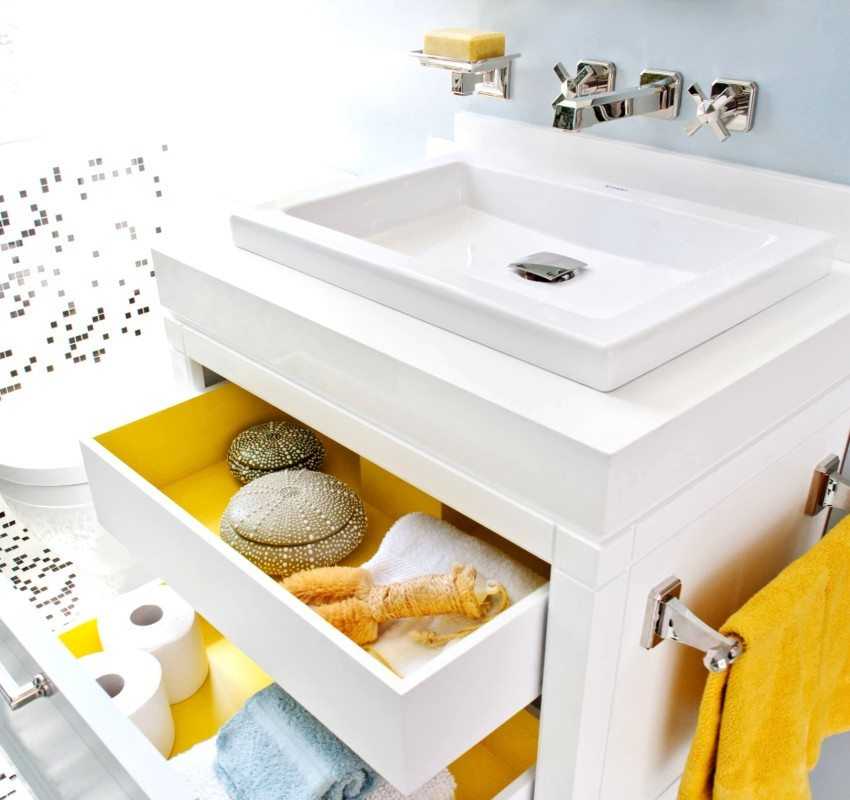 Столешница для раковины – это достаточно новое решение в интерьере ванных комнат. Преимущества таких столешниц в том, что вместо различных шкафчиков и полочек теперь в вашем распоряжении целый стол, на котором можно хранить множество принадлежностей. Под столешницей можно поместить стиральную машину и любую конструкцию с выдвижными ящиками.