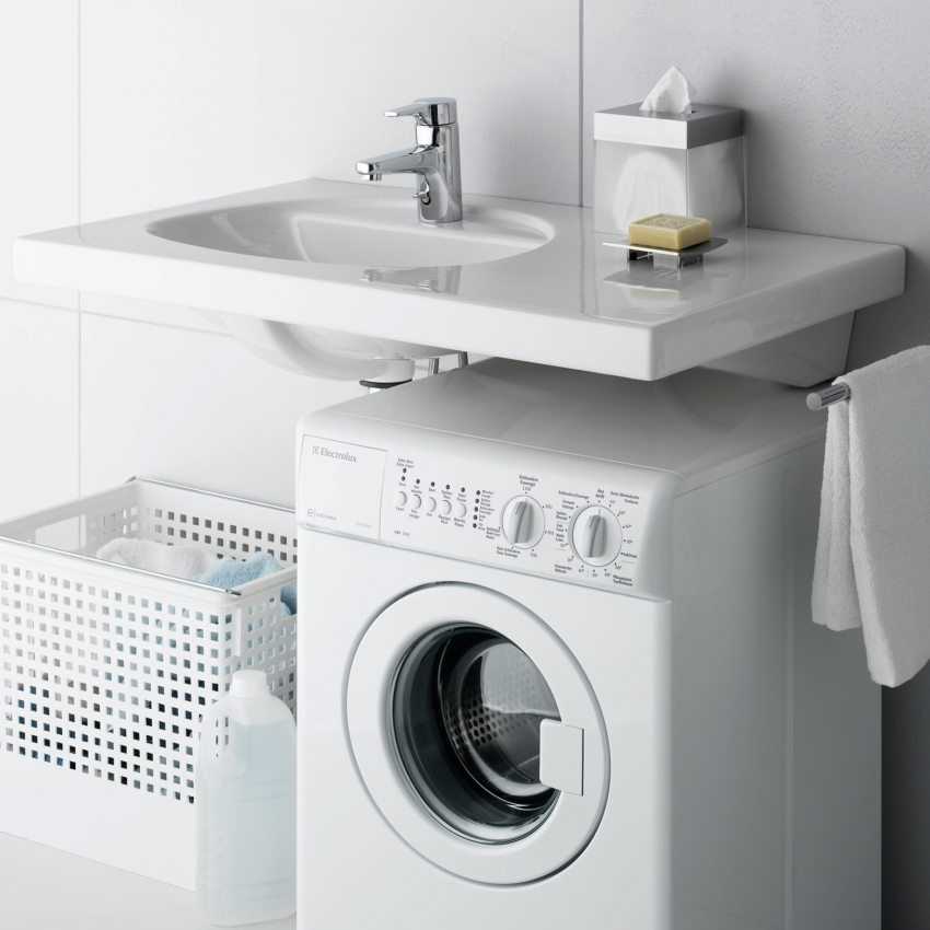Кроме кувшинки, существует еще одна разновидность – раковина со столешницей под стиральную машину. Ее особенность в асимметричности, т.е. слева или справа от чаши имеется горизонтальная поверхность, под которую устанавливается стиральная машина. Хороша такая модель тем, что столешница создает дополнительное пространство для хранения ванных принадлежностей, а под самой чашей можно установить тумбочку, или поставить корзину для белья. Фото стиральных машин под раковиной в ванной наглядно демонстрируют удобство такого расположения.