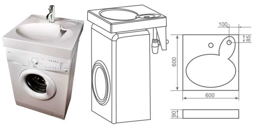 Существует еще одна форма встраиваемой чаши, предназначенная для установки над стиральной машиной – раковина-кувшинка. Особенность ее состоит в расположении сливного отверстия, которое, в отличие от стандартных моделей, смещено от центра и находится на краю раковины. Это позволяет размещать сифон и канализационные трубы практически впритык к стене, что дает возможность установить под чашей стиральную машину.