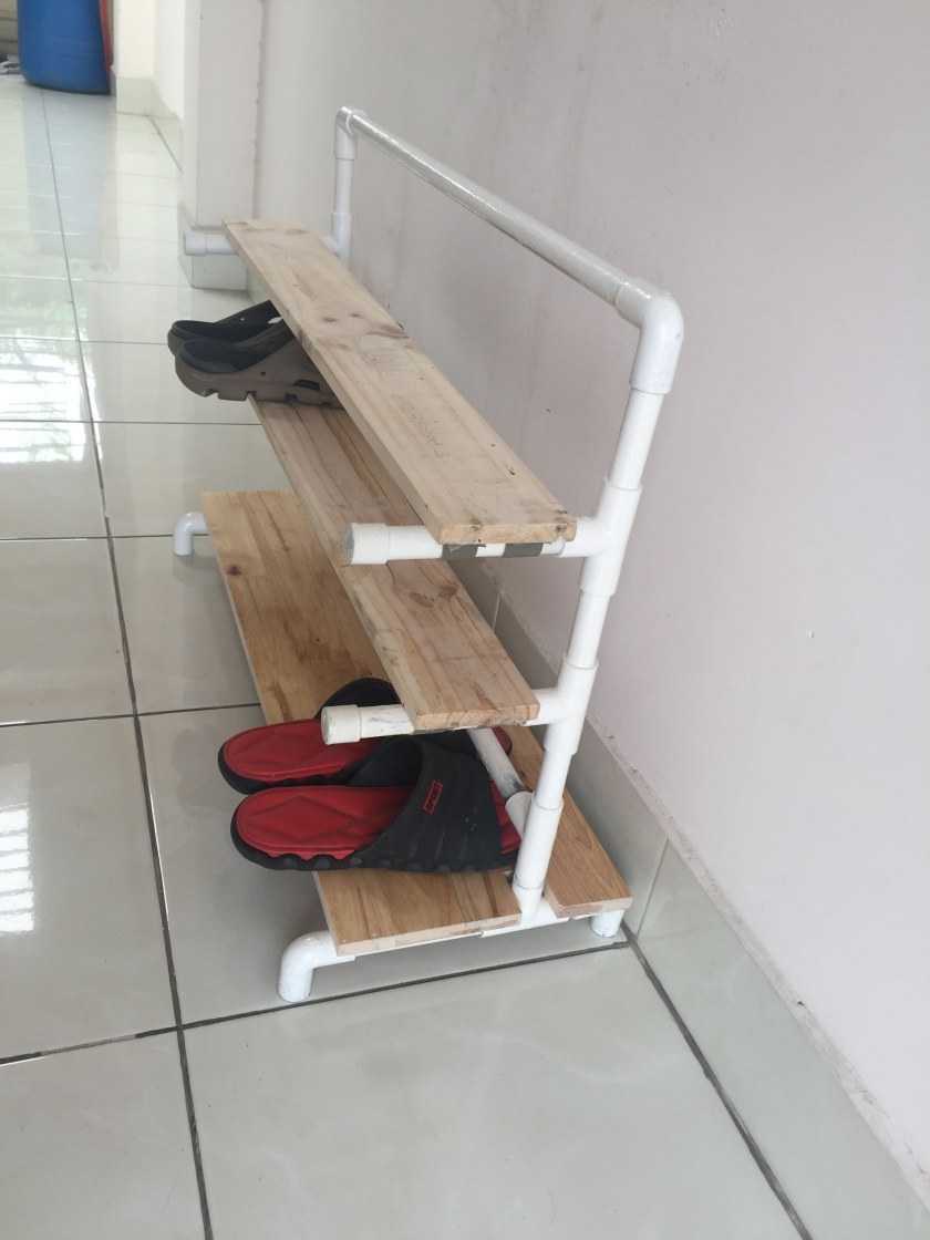 Оставшуюся трубу от проводки канализации используйте в качестве стильной полочки для обуви. Диаметр трубы должен быть минимум 150 мм для того, чтобы Вы смогли комфортно разместить свою пару обуви. Нарежьте трубу на фрагменты длиной 25-30 см (чуть больше длины ботинок).