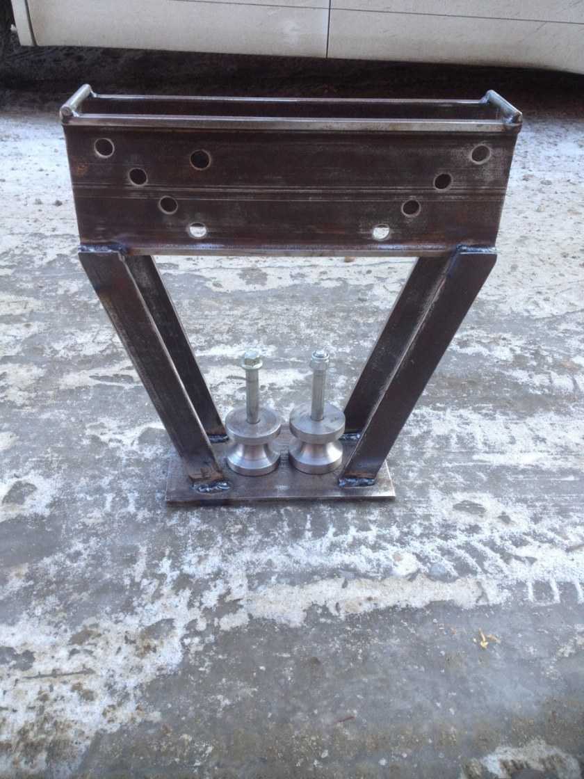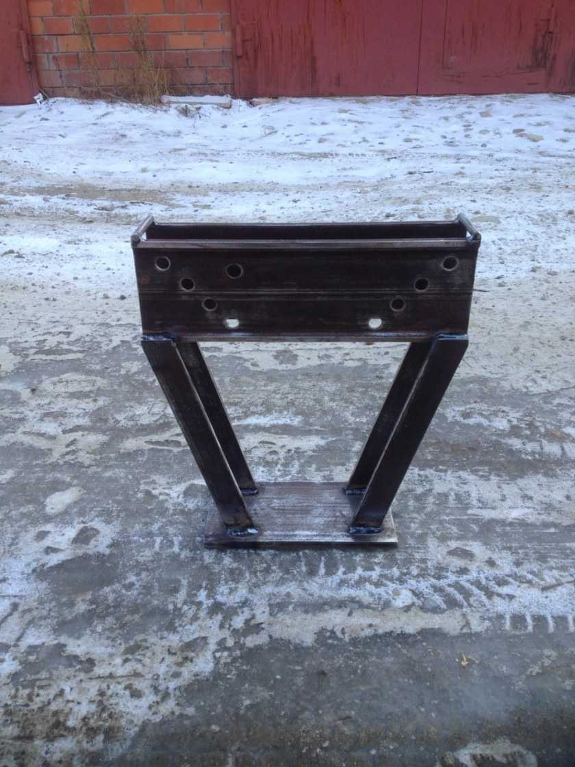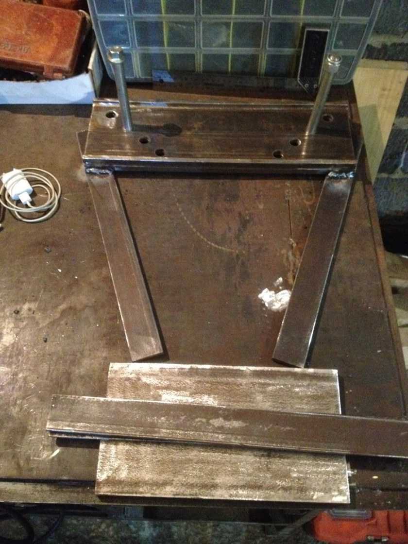 Станина будущего станка собирается из уголков, закрепленных на стальной плите посредством сварки. Всего используется четыре уголка, имеющих полку от 60 до 80 мм, на верхних концах которых фиксируют с помощью сварки два швеллера. Для регулировки угла загиба предусматривается необходимость наличия симметричных отверстий в стенках швеллеров, которые требуется высверлить.