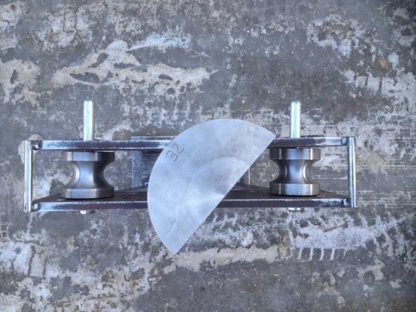 Для конструирования такового устройства нужен швеллер и домкрат гидравлический. Для домкрата изготавливается специальная полочка, в которой он устанавливается. В верхней рабочей части между двумя швеллерами монтируются два ролика из стальной трубы. Расстояние между роликами и пятаком домкрата должно быть одинаковым, чтобы иметь возможность получать ровные и аккуратные изгибы.