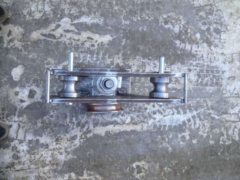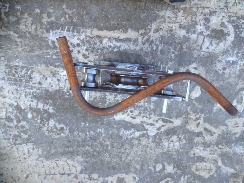 Пруты играют роль осей, куда помещают ролики. Размер желоба обязан соответствовать тому диаметру, которым обладает сгибаемая труба. Чтобы использовать станок, потребуется установить заготовку между роликами, а один ее конец прочно закрепить. Второй привязывают к лебедке. Именно она должна дать требуемое усилие для сгиба трубы. Лебедка может быть как электрической, так и ручной.