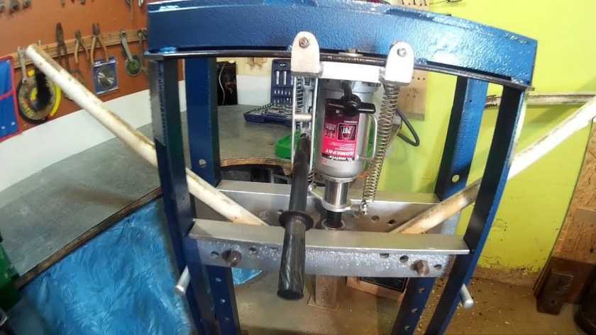Чтобы согнуть заготовку понадобится домкрат, способный развивать усилие в 5 тонн и более. При этом потребуется его модернизация за счет установки на выдвижном штоке стальной платформы, для изготовления которой можно использовать выработанный шкив, имеющей ширину «ручейка» сопоставимую с профилем трубы. В данном случае обустройство гидравлического привода предполагает отрезание половины шкива и высверливание в нем посадочного места под шток домкрата.