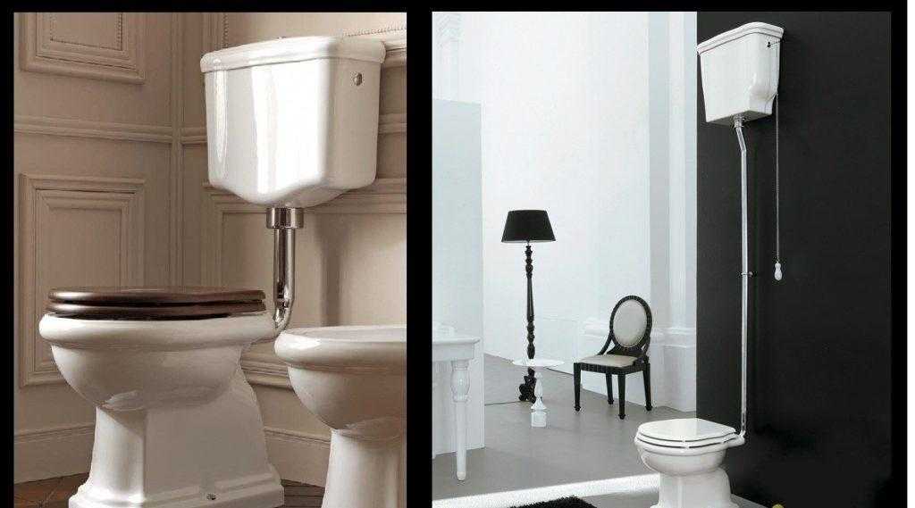 - Высокое. Унитаз и бак для смыва соединены длинной трубой, и такое расположение обеспечивает сильный напор воды в трубе. Сейчас эти системы изживают себя ввиду малопривлекательного вида, несовершенной фурнитуры и значительного шума при спуске жидкости.