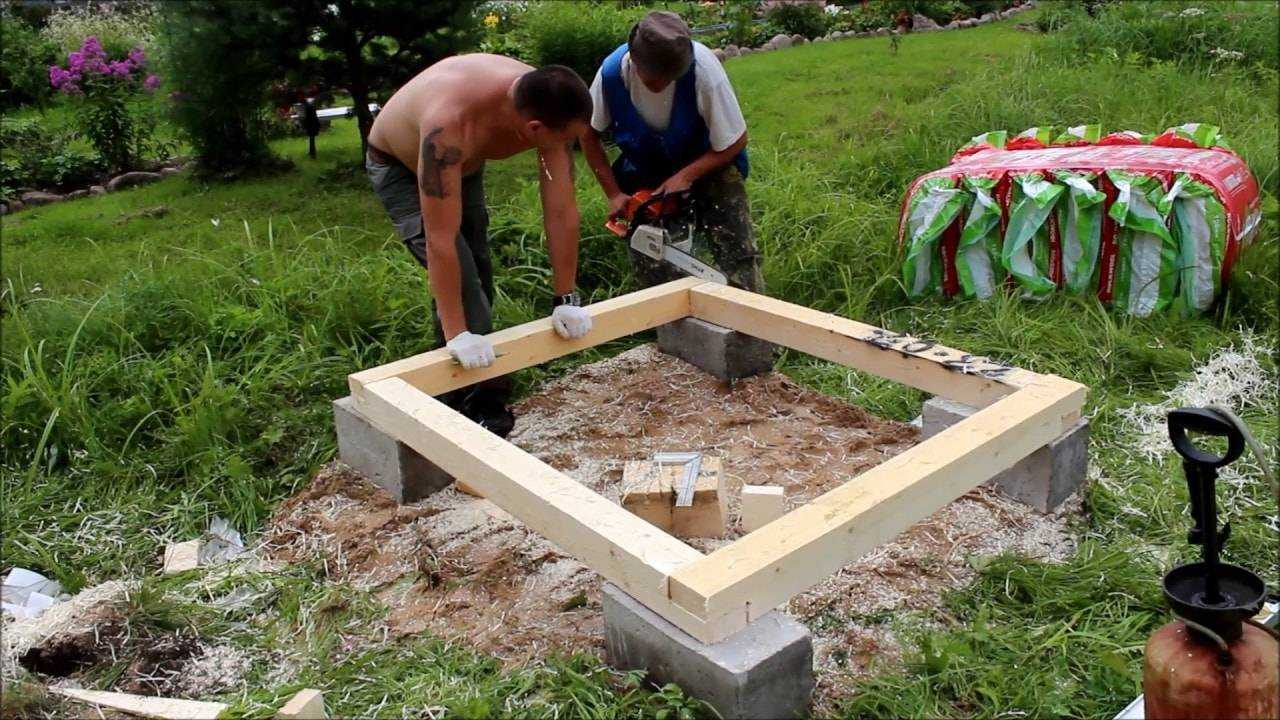 Строить каркас туалета можно с фундаментом или без него. В первом случае предпочтение отдают столбчатым конструкциям и монолитным бетонным блокам. Их обрабатывают рубероидом для изоляции от влаги, после чего укладывают в 2-3 слоя. Затем устанавливают напольное покрытие – доски или пластины с шириной 10-15 см и длиной, соответствующей размерам будущего здания. Заканчивают строительство пола размещением технологического отверстия у места, где будет задняя стенка конструкции.