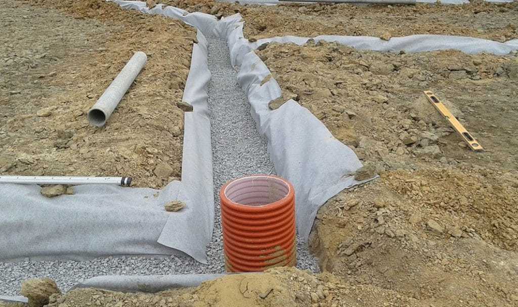 - Установка труб, засыпка гравием, сворачивание геотекстиля, засыпка верхним слоем грунта.