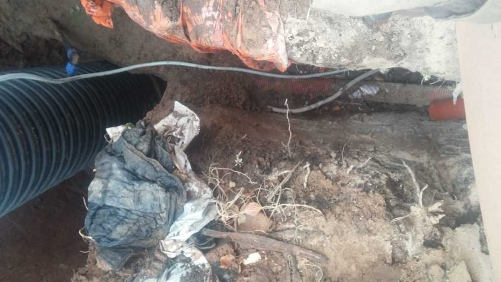 Отводящая труба уже в траншее и выведена в центральную канализацию, оставалось соединить ее со станцией. Копаем котлован для установки канализационной насосной санции.