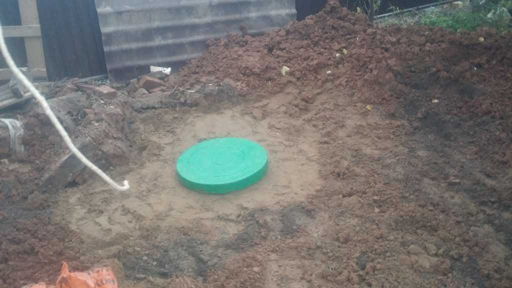 Хороша туба еще тем, что она легкая так как состоит только из пластика, мы легко опустили ее и установили на место. Далее с помощью троса туба была надежно закреплена к жб плите. Теперь можно заводить отводящую трубу (ПНД 32) и начинать закапывать.