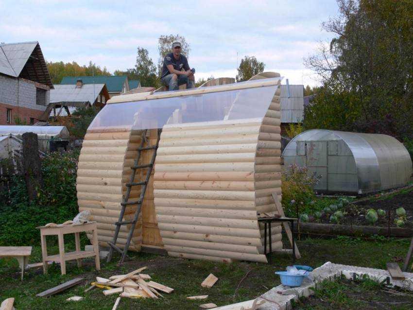 Сотовый поликарбонат – достаточно гибкий и простой в работе материал, поэтому при вдохновении вы можете сотворить из него конструкцию почти любой формы. Округлая душевая кабинка жизнерадостного желтого цвет потребует только соответствующей формы каркаса, но станет украшением ландшафта и предметом восхищения соседей.