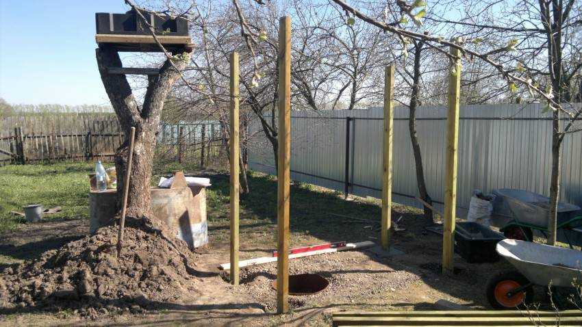 К имеющемуся уже столбу (от забора), добавили еще три. Использовали круглую трубу (давно лежала в сарае). Под столбы выкопаны ямки глубиной 70-80 см. В них установлены столбы, засыпаны щебнем. Щебень утрамбовали и залили бетоном.