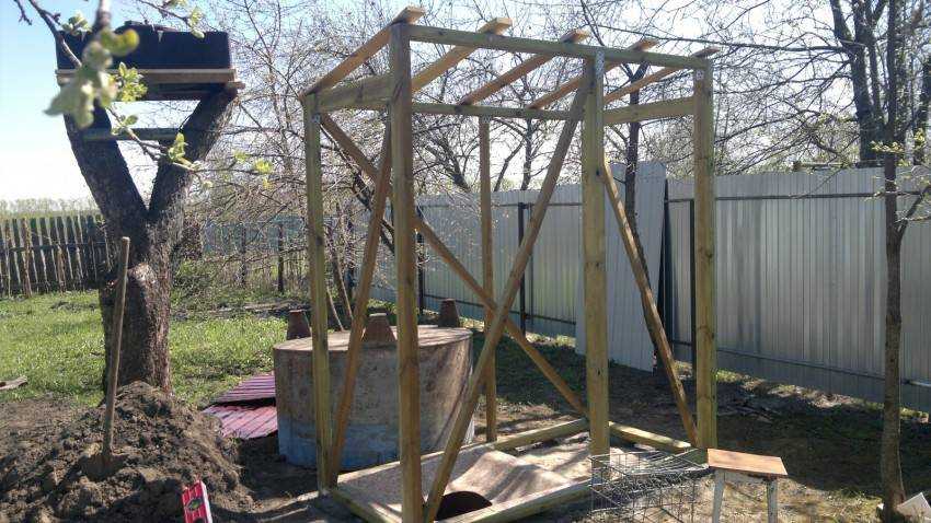 Далее делается каркас душа, который в дальнейшем будет обшиваться и создавать тем самым душевую кабину. Каркас делается из брусьев, высота их зависит, от желаемой высоты душа, ширина такого бруса, как правило, 15-17 см.