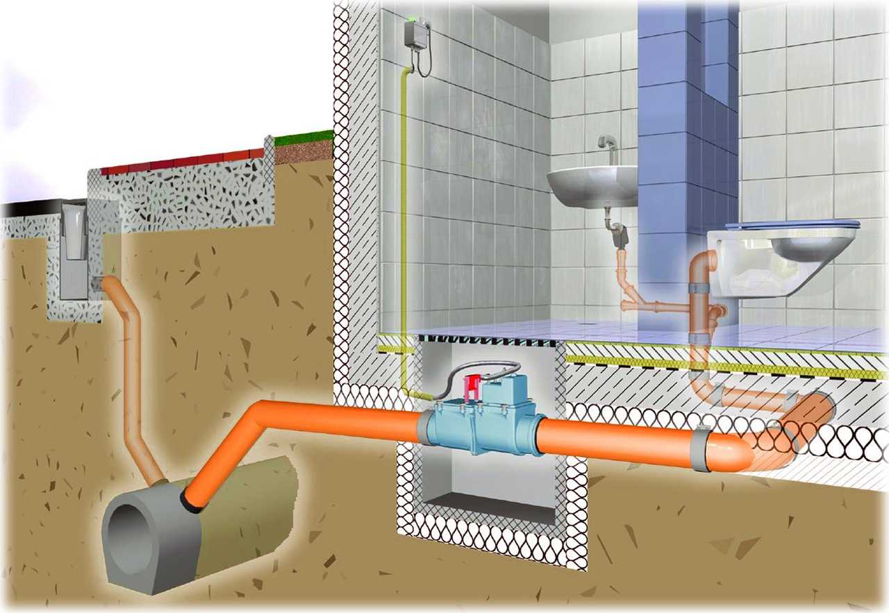Стояк подводят к фундаменту, в котором заранее пробито отверстие диаметром 130-160 мм. В него обязательно вставляют металлическую гильзу. Через неё выводят трубу коллектора наружу. Место вывода наружной трубы качественно утепляют, зазоры между гильзой и фундаментом бетонируют.