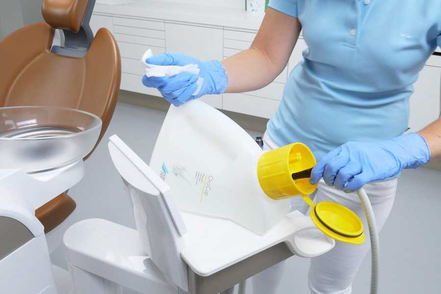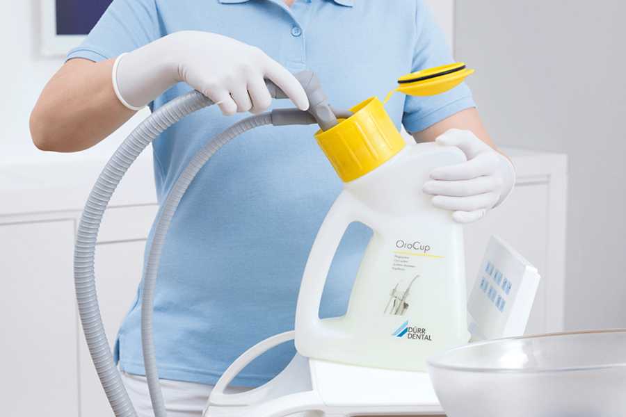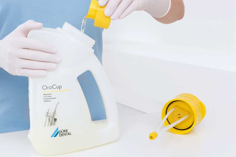 Алгоритм действий такой же, как при дезинфекции: литр готового раствора залейте в мерную ёмкость OroCup, затем подайте жидкость в систему через шланги пылесоса и слюноотсоса. Для очистки чаши плевательницы тоже достаточно залить в нее 250 мл.