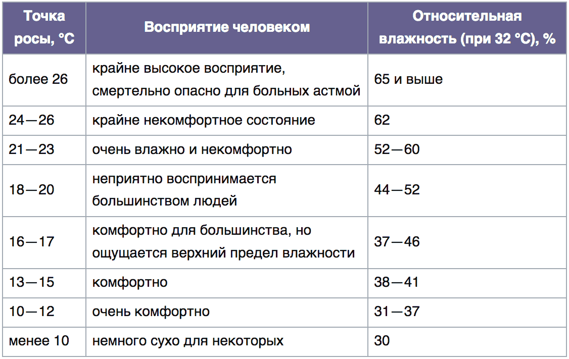 Таблица определения точки росы в зависимости от температуры воздуха и влажности.
