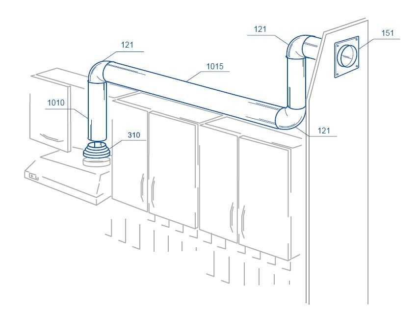 Такой вариант идеально подходит для тех гарнитуров, в которых вытяжка расположена максимально близко к вентиляционному отверстию.