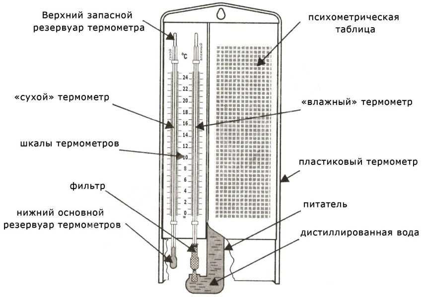 Конструкция психрометра состоит из пары спиртовых или ртутных психрометров. Во время испарения жидкости происходит охлаждение влажного термометра. Чем ниже уровень влажности воздуха, тем быстрее испаряется жидкость. В свою очередь, чем суше воздух, тем меньше температурный показатель, отображаемый мокрым термометров. За счет этого и возникает разница между показаниями.