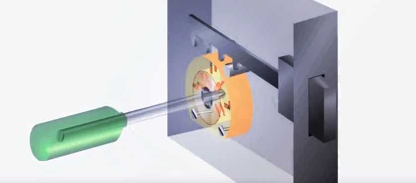 Если замочный механизм имеет крестообразный тип, то его просто вскрыть отверткой. Для начала необходимо снять внешнюю деталь и в место, куда вставляется ключ, вставить отвертку и провернуть в нужном направлении, чтобы немного счесать пины.