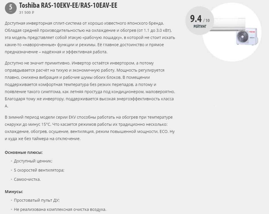 - Toshiba RAS-07EKV-EE (Россия, UA, Беларусь, Казахстан, Кыргызстан) — инверторная сплит система с плавной регулировкой температуры и низким уровнем шума, идеально подходит для дома. По функциональности и качеству сборки она соответствует элитной техники, но цена в некоторых магазинах вполне приемлемая. (Россия, Россия, Россия).