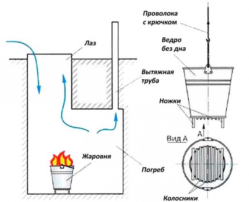 Если установить источник тепла, прогреть помещение погреба, намного быстрее. Это может быть жаровня, печка-буржуйка, электронагреватель и да-же, обычная газовая горелка. Применение открытого огня, заставляет решать задачу, эффективного удаления продуктов горения: угарный газ и т.п. Поэтому, такой источник тепла, обычно опускают вниз на подвеске.