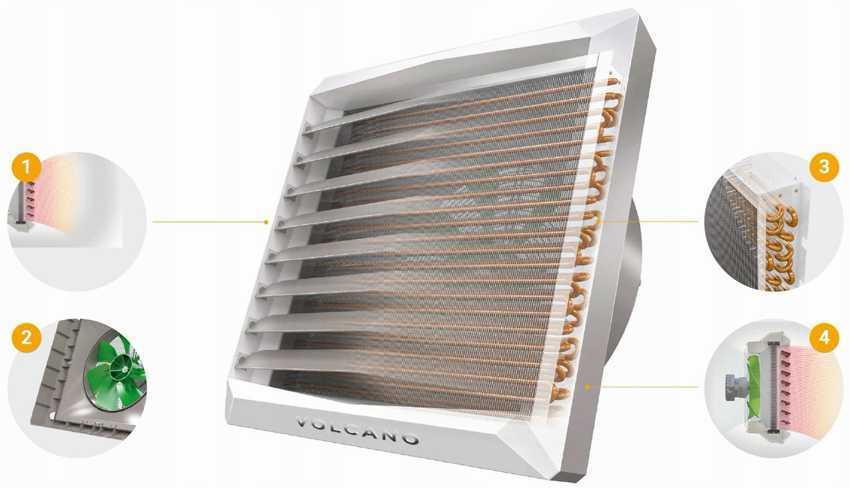 Строение калорифера Volcano: 1 — подвижные регулируемые лопатки, 2 — встроенный диффузор с вентилятором, 3 — нагревательные элементы, 4 — подача тёплого воздуха.