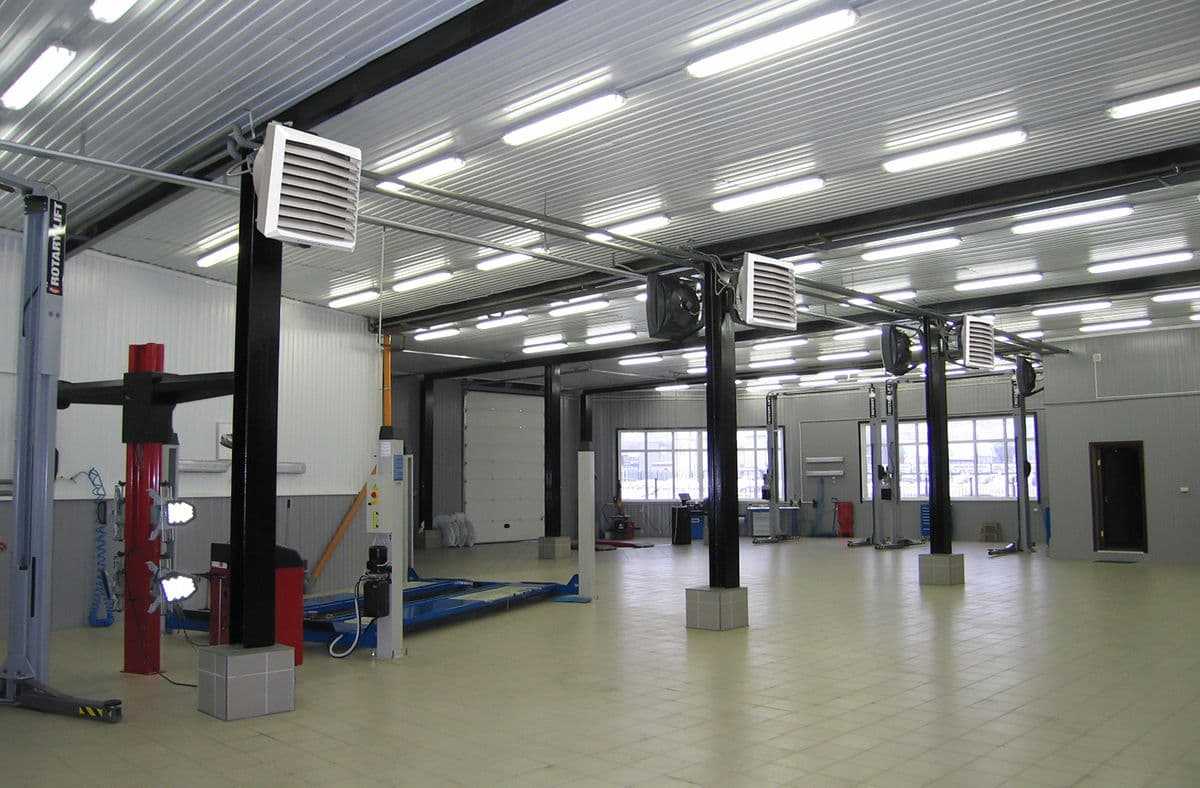 Пример отопления калориферами помещения сервиса технического обслуживания автомобилей.