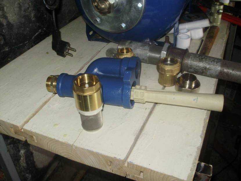 Если станция ставится в доме или в кессоне где-то на пути к дому, схема подключения одинакова. На подающем трубопроводе, опущенном в колодец или скважину устанавливается фильтр (чаще всего — обычный сетчатый), после него ставится обратный клапан, затем уже идет труба. Зачем фильтр — понятно — для защиты от механических примесей. Обратный клапан нужен для того, чтобы при отключении насоса вода под собственным весом не стекала обратно. Тогда насос будет включаться реже (дольше прослужит).
