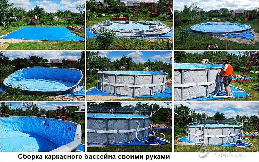 Более крепким является каркасный бассейн, который бывает двух видов — разборный и стационарный. Его конструкция состоит из металлической рамы и плотного вкладыша. Его можно закопать, либо просто установить на земле, выбрав гладкую поверхность. Каркасный бассейн имеет свои плюсы, такие как легкость сборки, надежность и прочность. К минусам относится высокая цена и сложность доставки до места установки.