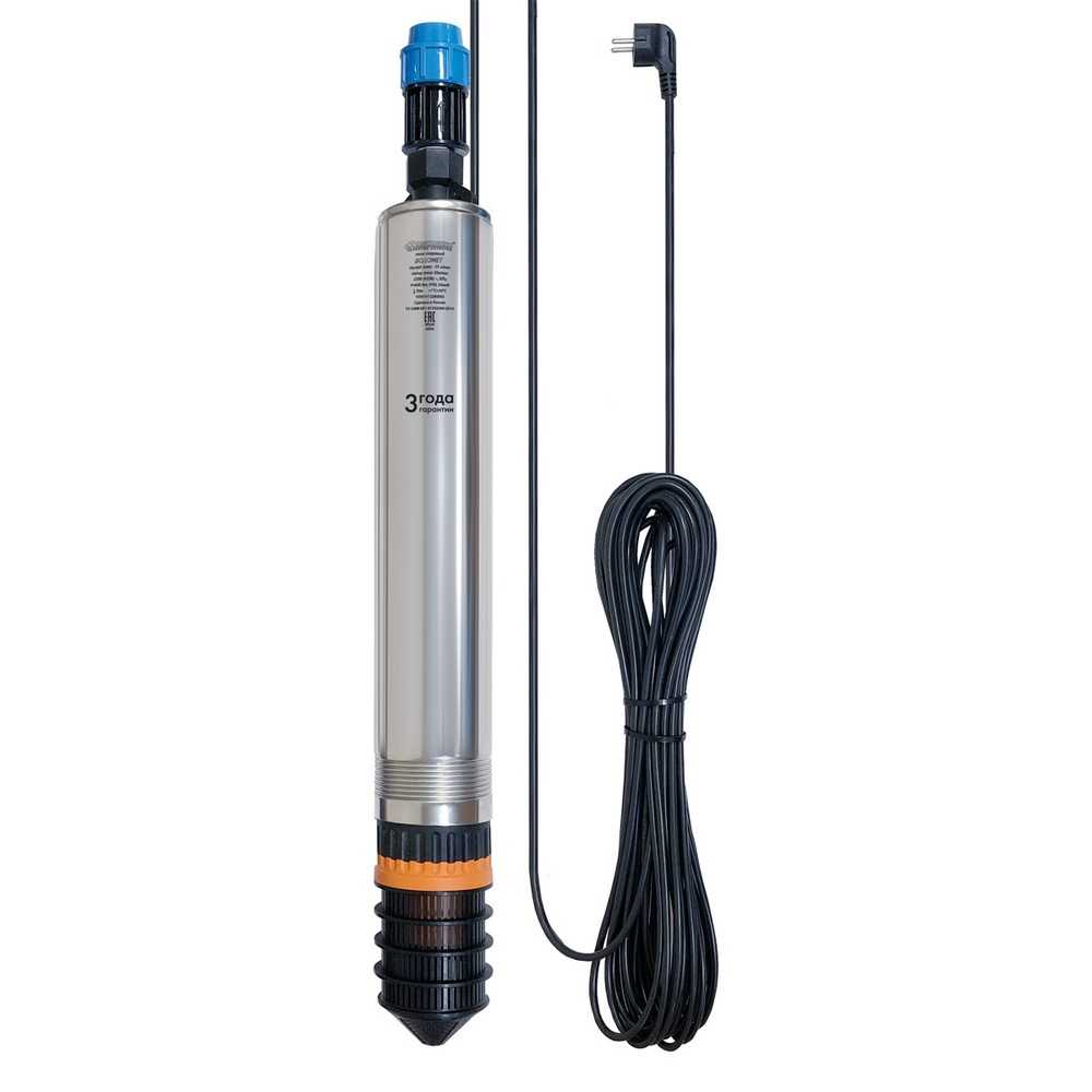 У этого прибора, например, хорошая производительность (3.5 кубометров в час), а также достаточно мощный электромотор на 830 Вт. Глубина погружения у этой модели – 80 м, что значительно больше, чем у «бронзового» призера. Напор в сравнении с «бронзой» стал больше – у этой модели он аж 100 м. За счет длинного сетевого шнура в 70 метров можно позабыть о проблеме подключения к сети 220 В.