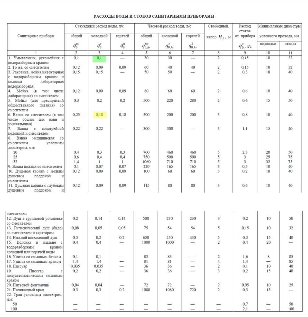 Таблица №2. Таблица расходных норм для сантехнических приборов из СНиП 2.04.-85