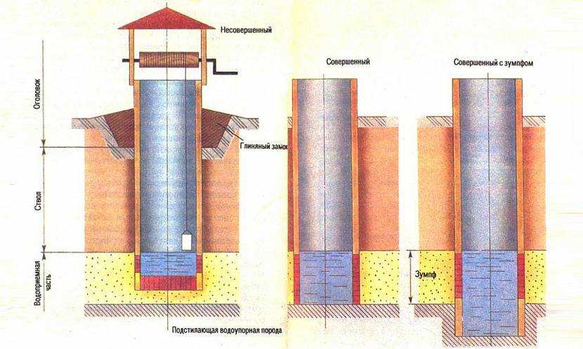 - Совершенного типа. Это когда ствол шахты упирается в прочную породу. В этом случае вода проникает в колодец только через стенки.