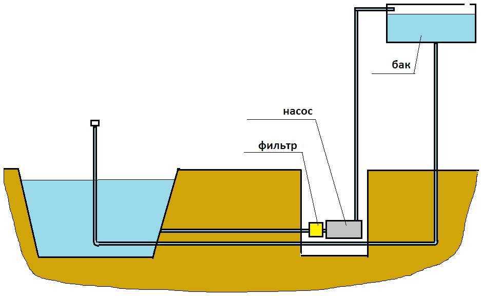 Пластиковая емкость, а насос находится на дне, прямо в том месте, где из воды торчит труба
