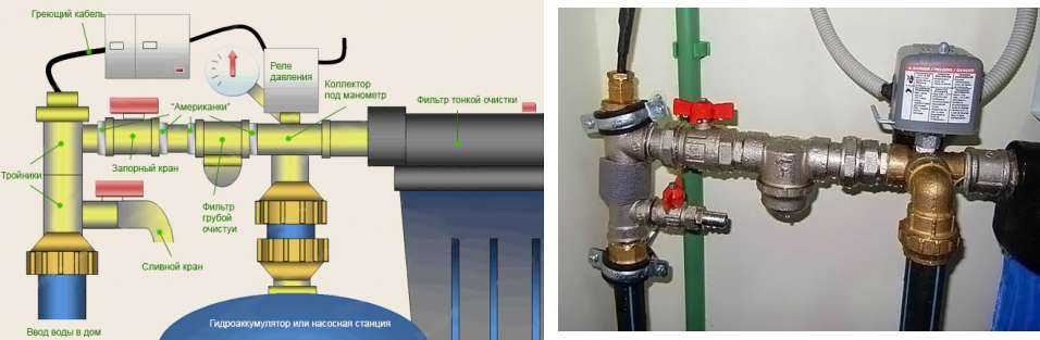 Манометр служит для контроля текущего давления в системе, а реле является важнейшим элементом управления насосной станцией. Оно управляет подачей воды в напорную емкость по заданным параметрам и обеспечивает автоматический режим работы насоса, включая и выключая его.