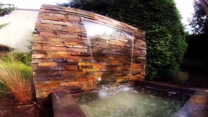 Разновидностью таких фонтанов являются пристенные. При их монтаже используются стены домов, изгороди и беседки, по которым стекает вода в расположенные снизу чаши. В этом случае применяется насос для водопада.