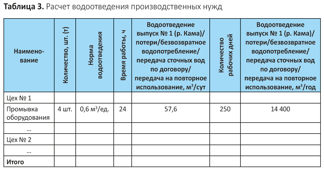 Нормы водоотведения обычно представлены в тех же документах, причем может быть указан только процент объема, который поступает на выпуск сточных вод/в потери/остается в продукции. К потерям можно отнести испарение, унос ветром. В случае если вода остается в продукции (например, производство бетона), можно добавить безвозвратное водопотребление. Для удобства расчет можно показать в виде табл. 2.