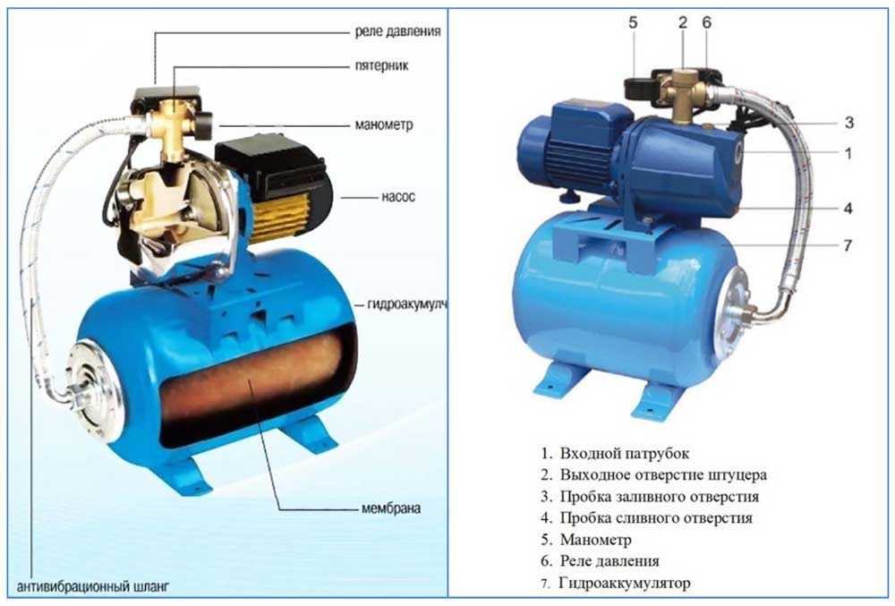 Если же он используется в составе насосной станции, то насос соединяют с гидроаккумулятором посредством специального штуцера на пять выходов. Кроме того, насос необходимо будет подключить к контактам реле давления, чтобы обеспечить его автоматическое включение и отключение.