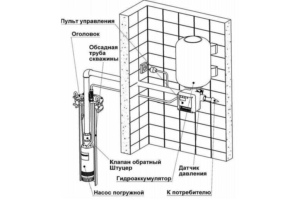 В этом случае насосное оборудование опускается в воду. Вся вода, поступающая из скважины, будет выталкиваться по вертикальному трубопроводу насосом. При этом исполнении, схема водоснабжения скважины гидроаккумулятором должна включать обратный клапан. Как следствие, вода не будет уходить из мембраны к насосу. В большинстве случаев, обратный клапан устанавливается сразу после насоса. Дальше идет напорный трубопровод на поверхность.
