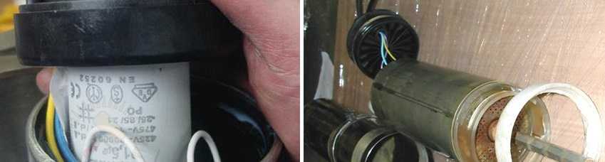 В насосах монолитной конструкции двигатель нужно выдавить из стакана, нажав на отвод подключения отходящего трубопровода при снятых крыльчатках. В штоковых насосах моторная часть отсоединяется при расстыковке двух половин, в шнековых — после снятия рабочего винта. Во всех случаях к внутренностям двигателя (конденсатору, соединительным клеммам) можно добраться только после снятия герметичной пробки. Она фиксируется 2–3 винтами на боковой поверхности гильзы и мощным стопорным кольцом. В некоторых разновидностях насоса пробка может требовать применения специального съёмника.