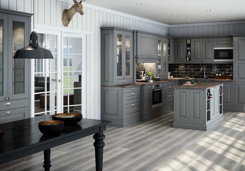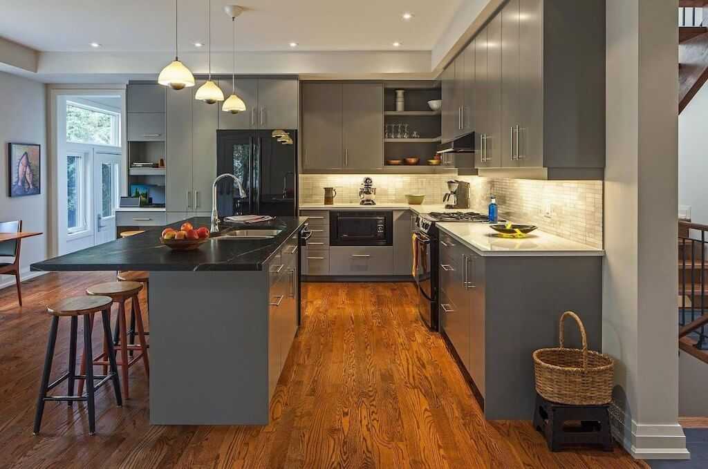 Чтобы визуально увеличить комнату с низкими потолками, достаточно заказать серый кухонный гарнитур без верхних шкафов. Если они необходимы, то стоит их сделать более светлыми и приглушенными, чем нижние модули. Наличие антресолей «давит» и уменьшает высоту стен.