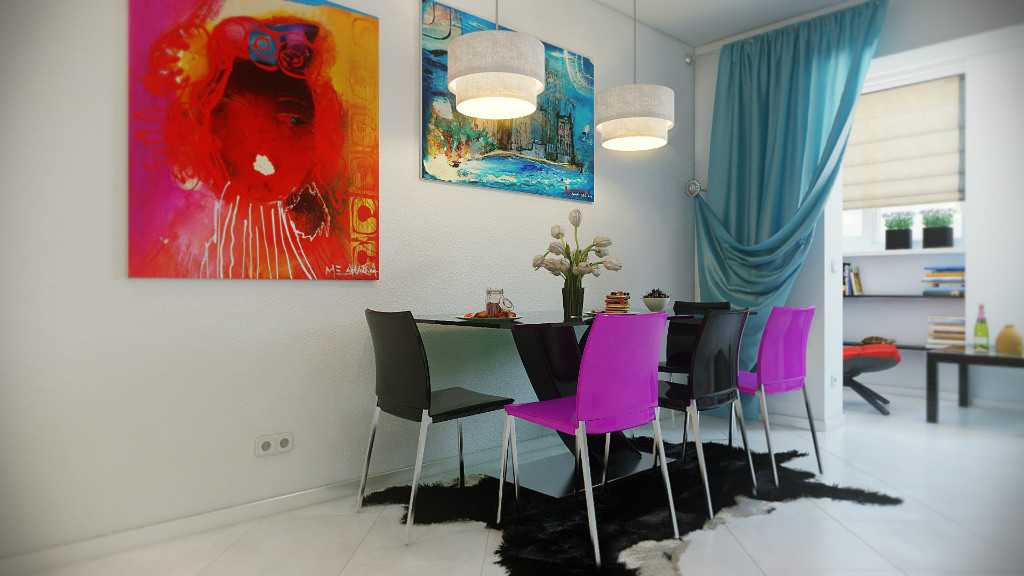 - Для современных динамичных стилей типа хай-тек, поп-арт и фьюжн подходят насыщенные и яркие оттенки.