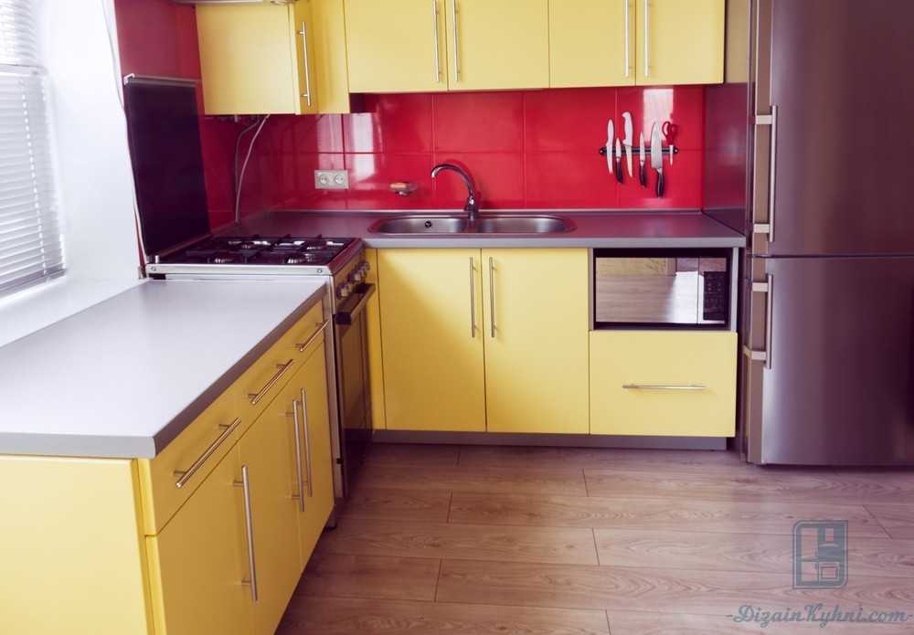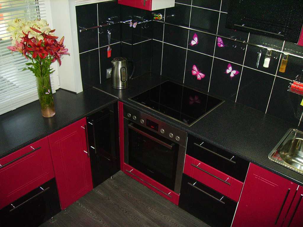 При выборе цвета шкафчиков лучше обратить внимание на различные оттенки основного цвета или же сделать выбор в пользу черно-белого гарнитура. Иначе получится чересчур яркая и неуютная кухня.