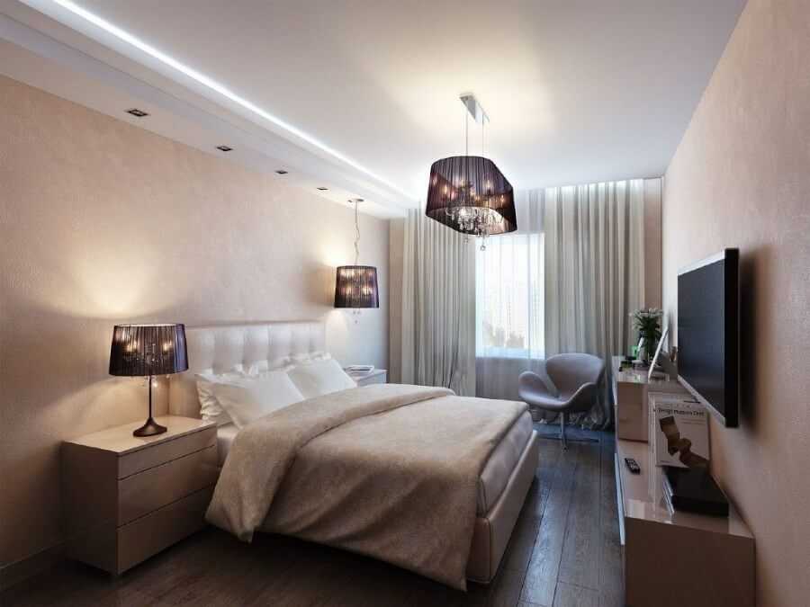 Как правило, эту комнату делают максимально спокойной и комфортной, поэтому тут должны брать преимущество светлые оттенки, которые также еще хороши для визуального увеличения пространства. Также тут как никогда будут актуальны натуральные материалы, которые не будут содержать никаких экологически небезопасных компонентов в своем составе и не будут вызывать какую-либо аллергию. Отлично в спальню подойдет натуральное дерево, но как альтернативу можно использовать гипсокартон или натяжные конструкции, с помощью которых также получится сделать комфортное освещение и даже зонирование комнаты, если это требуется по проекту.