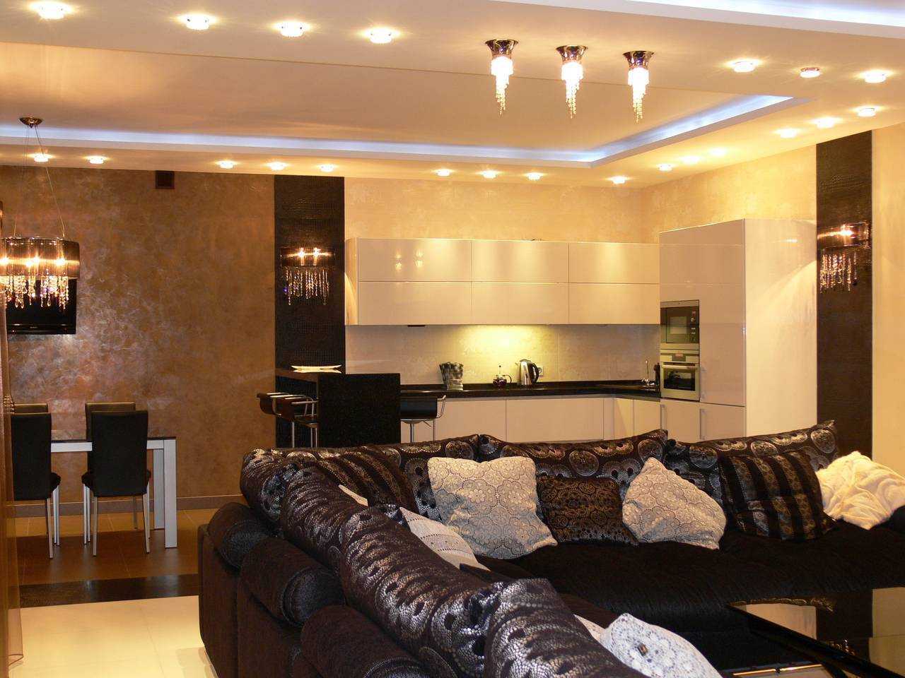 Потолок в кухне-гостиной из гипсокартона может иметь разные формы: от одного до четырех уровней. Одноуровневые конструкции самые простые, достаточно украсить их софитами, и дизайн потолка закончен.