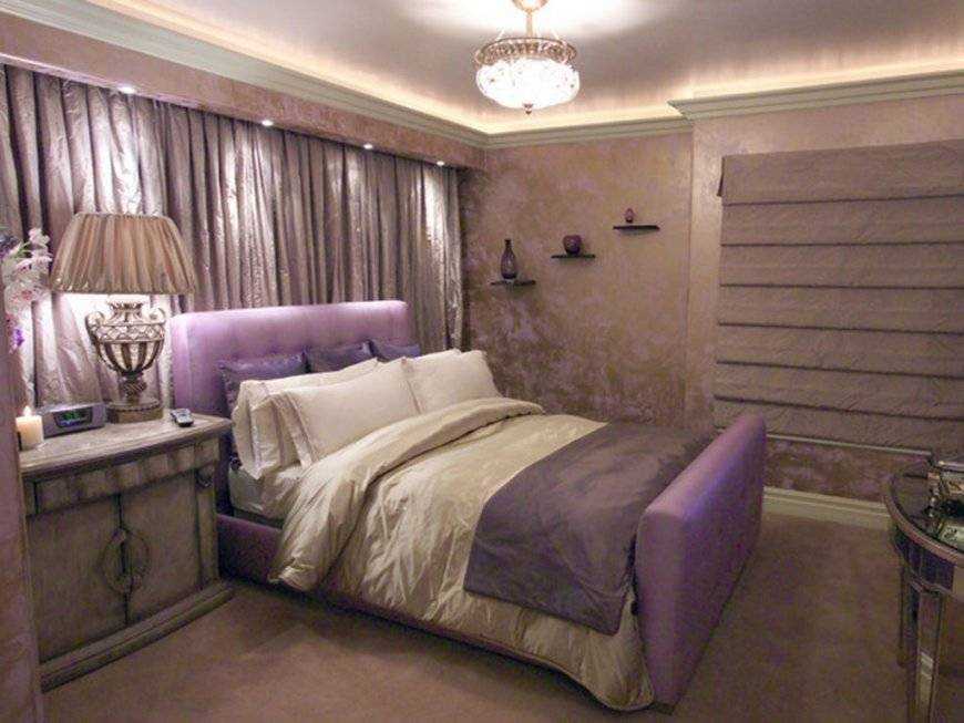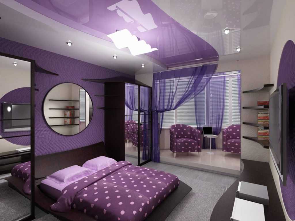 В этом случае спальню в фиолетовых тонах создают посредством добавления декора. Основной фон спальни остается светлым (реже темным), но в него добавляют разные предметы интерьера (например, шторы, подушки, белье, цветы, мебель). Так можно подобрать в стиль практичные элементы интерьера: темный и насыщенный цвет мебели или штор долговечен и способствует продлению срока службы. Кроме того, мебель необычного цвета будет смотреться очень красиво на фоне любых других предметов интерьера. Каждый раз она будет притягивать взгляд и напоминать об уникальности стиля спальни.