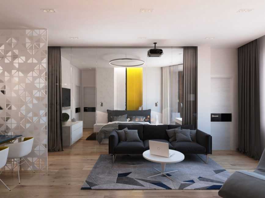 Разделение единственной комнаты на спальню и гостиную раздвижными стеклянными перегородкамиИсточник yandex.ru