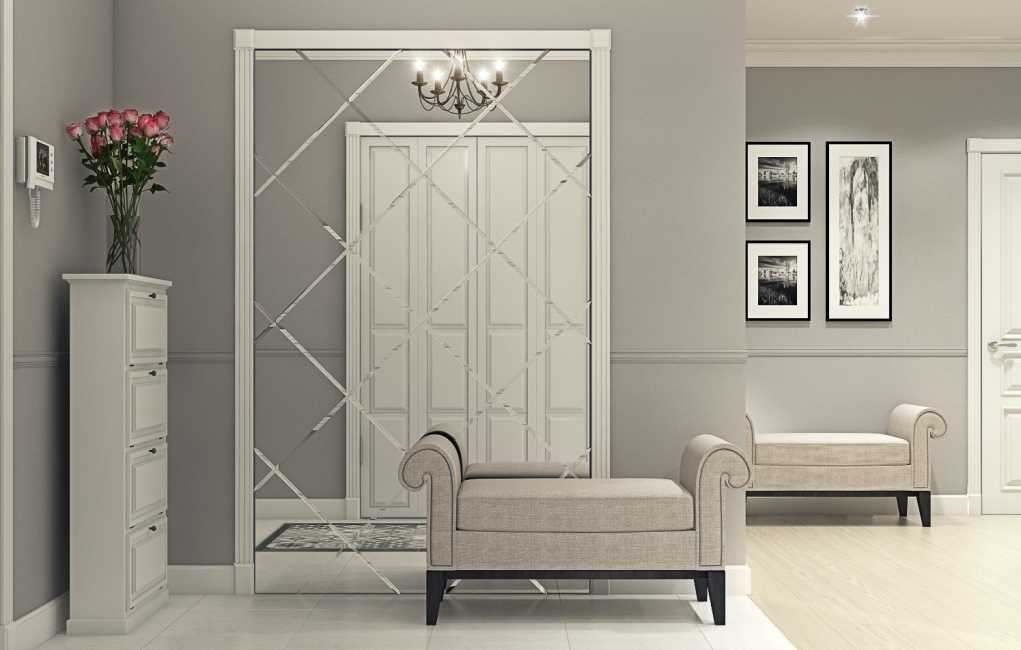 Хорошим способом увеличить, осветлить прихожую будет стена из зеркал. Это может быть одно зеркало от потолка до пола или мозаика из маленьких.